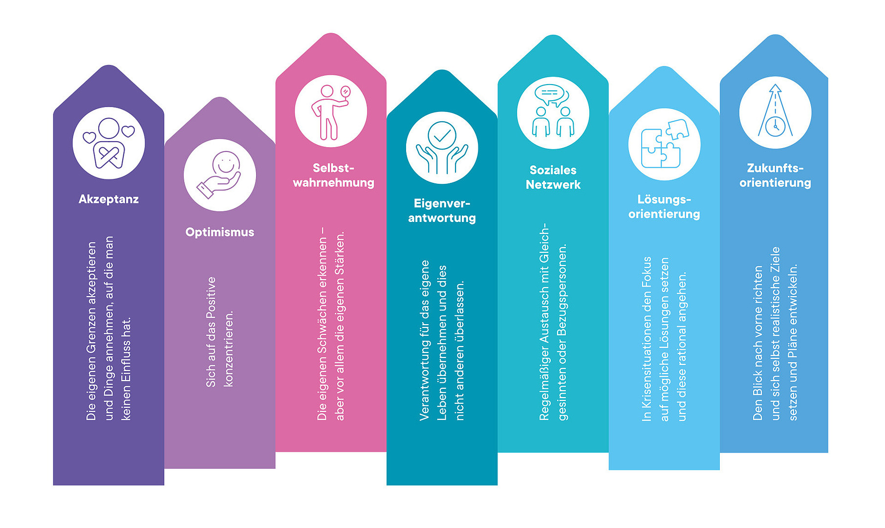 Die Resilienz ist wie ein Haus und baut auf sieben Säulen auf: Akzeptanz, Optimismus, gute Selbstwahrnehmung, Eigenverantwortung, ein gutes soziales Netzwerk, Lösungs- und Zukunftsorientierung. Diese Faktoren tragen dazu bei, dass Menschen widerstandsfähig gegenüber Belastungen sind. Sie im Blick zu haben, hilft zu erkennen, welche Aspekte der Resilienz für uns persönlich besonders wichtig sind und wo noch Handlungsbedarf besteht. „Im Idealfall kennen wir unsere Resilienzsäulen und wissen, welche besonders stabil sind und welche vielleicht noch nicht“, erklärt Röder. „Dann können wir gezielt an diesen Bereichen arbeiten, indem wir beispielsweise Mediationstechniken erlernen oder unser soziales Netzwerk bewusster pflegen.“